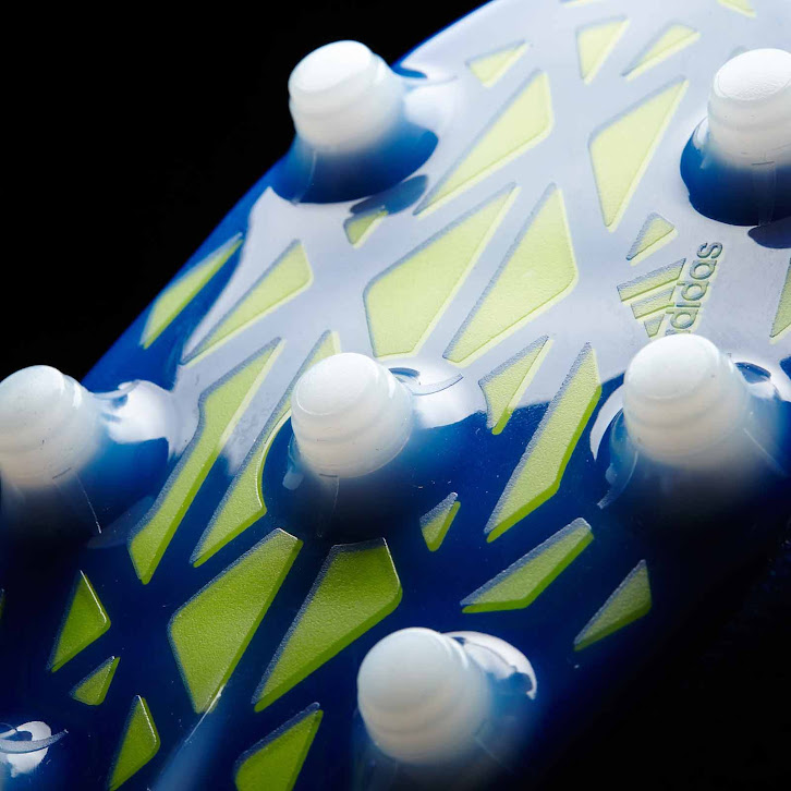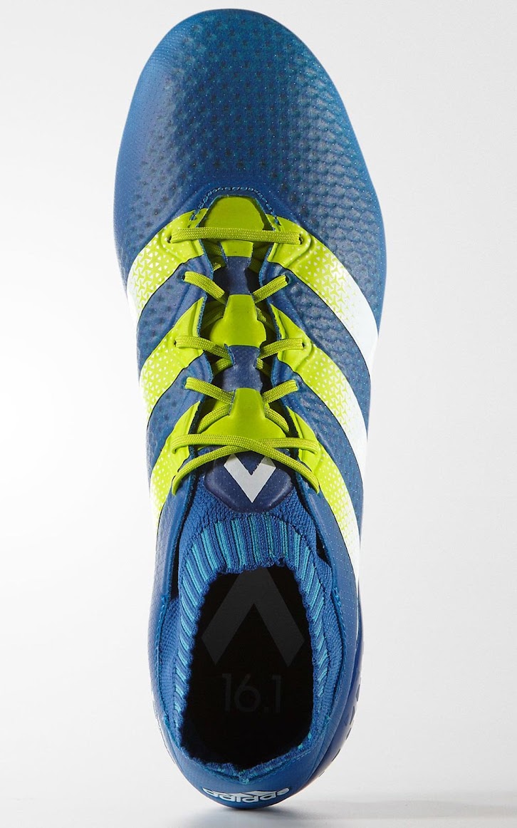Die neuen Adidas Ace 16+ Primeknit Schuhe, die fast ausschließlich in einem tiefen Blau gehalten sind, weisen auf jeder Seite auffällige Streifen mit Farbübergang auf; die Streifen gehen von Weiß (unten) nach oben hin zu dem grellen Grün über. Die Farbe wird auch für einen Teil der Außensohle der neuen Adidas Ace Primeknit Schuhe verwendet, während alle Markenzeichen in Weiß gehalten sind.