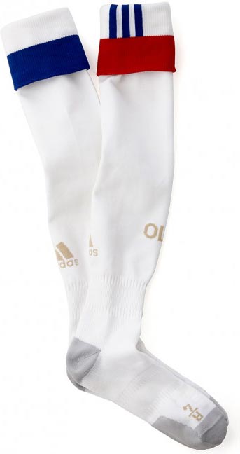 Weiße Hosen mit blauen Adidas-Streifen vervollständigen den sauberen Look des neuen Lyon-Trikots. Die Stutzen führen unterdessen das in zwei Hälften geteilte Design mit blauen beziehungsweise roten Details fort.