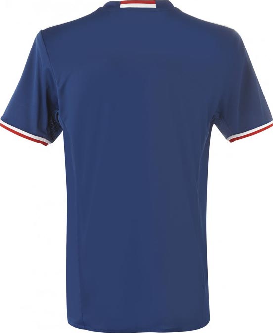 Das Lyon 16-17 Trikot ist dunkelblau mit vier Querstreifen eines helleren Farbtons auf der Vorderseite. Genau wie auf dem neuen Manchester United 16-17 Auswärtstrikot sind die Adidas-Streifen auf den Schultern des neuen Lyon-Trikots positioniert, das zudem feine weiße und rote Details aufweist.