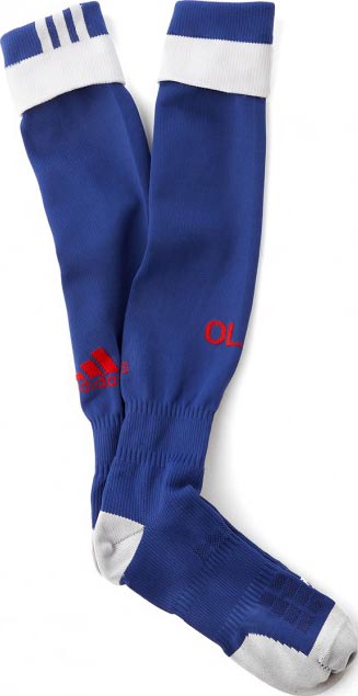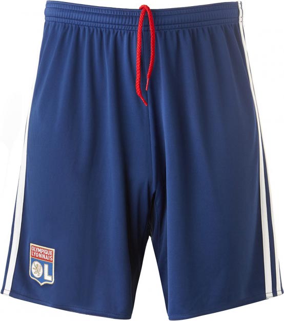 Die Hosen und Stutzen des neuen Lyon 16-17 Trikots sind dunkelblau mit weißen und roten Details.