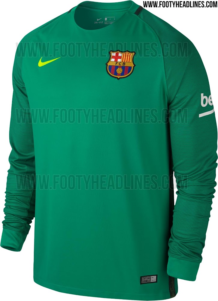 Das zweite Barcelona 2016-17 Torwart-Trikot, das auf dem selben Template basiert, ist grün mit einem gelben Nike-Swoosh.