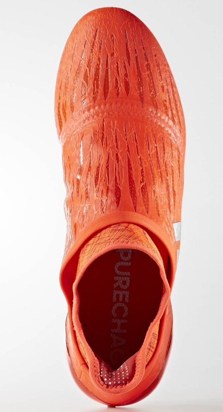 Die roten Adidas X 16+ PureChaos Schuhe, die im Juli 2016 veröffentlicht wurden, führen ein atemberaubendes Design ein. Sie weisen ein (fast) schnürsenkelloses Design auf, das dem des Adidas Ace 16+ PureControl ähnelt.