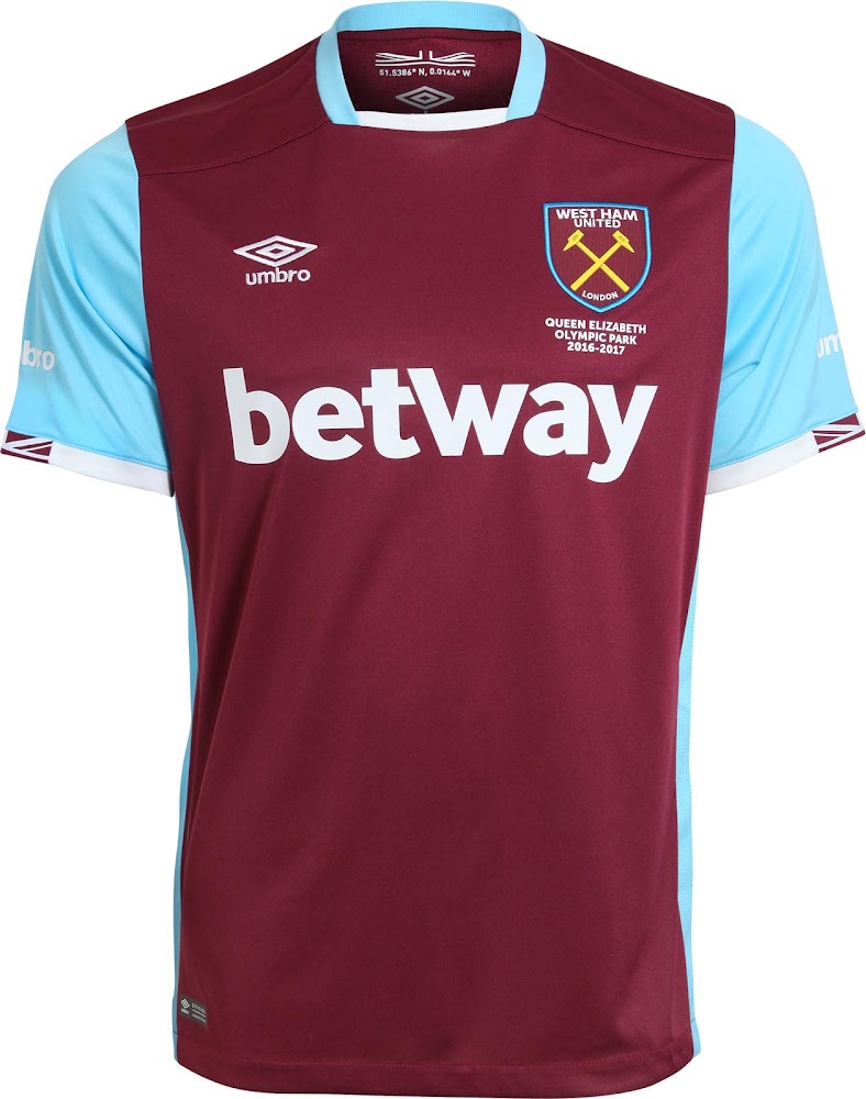 Das neue West-Ham-Trikot, das im traditionellen Stil des Klubs (weinroter Körper und blaue Ärmel) gehalten ist, weist zum allerersten Mal das neue Vereinswappen auf. Unterhalb steht "Queen Elizabeth Olympic Park 2016-2017" geschrieben, womit West Hams historischer Umzug ins Stadion von Olympia 2012 für immer mit dem Umbro West Ham 2016-2017 Trikot in Verbindung gebracht wird.
