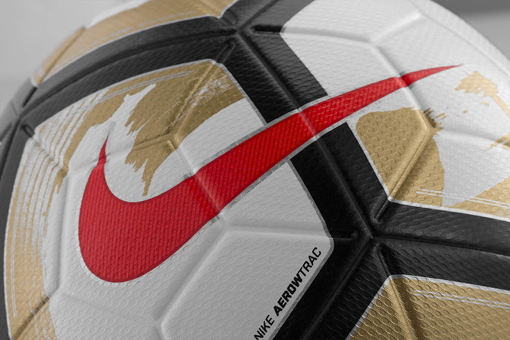 Das goldene Copa America Centenario 2016 Logo ist auf dem mittleren Panel des Nike Ordem Campeon Copa America Centenario 2016 Fußballs sichtbar, das auch einen großen roten Swoosh integriert.