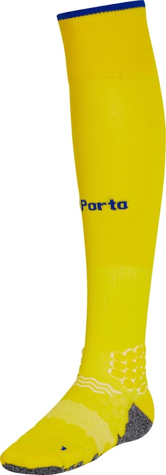 Hosen und Stutzen des Porto 2016-17 Trikots sind beide gelb mit blauen Applikationen.