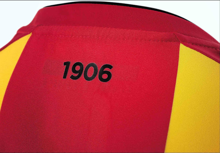 Das neue Lens 2016-2017 Trikot setzt auf große gelbe und rote Streifen und schwarze Ärmel. Es hat einen V-Kragen und die Koordinaten von Lens Stadion innerhalb.