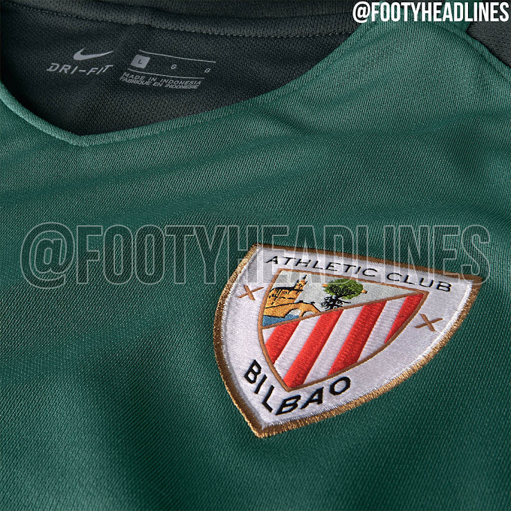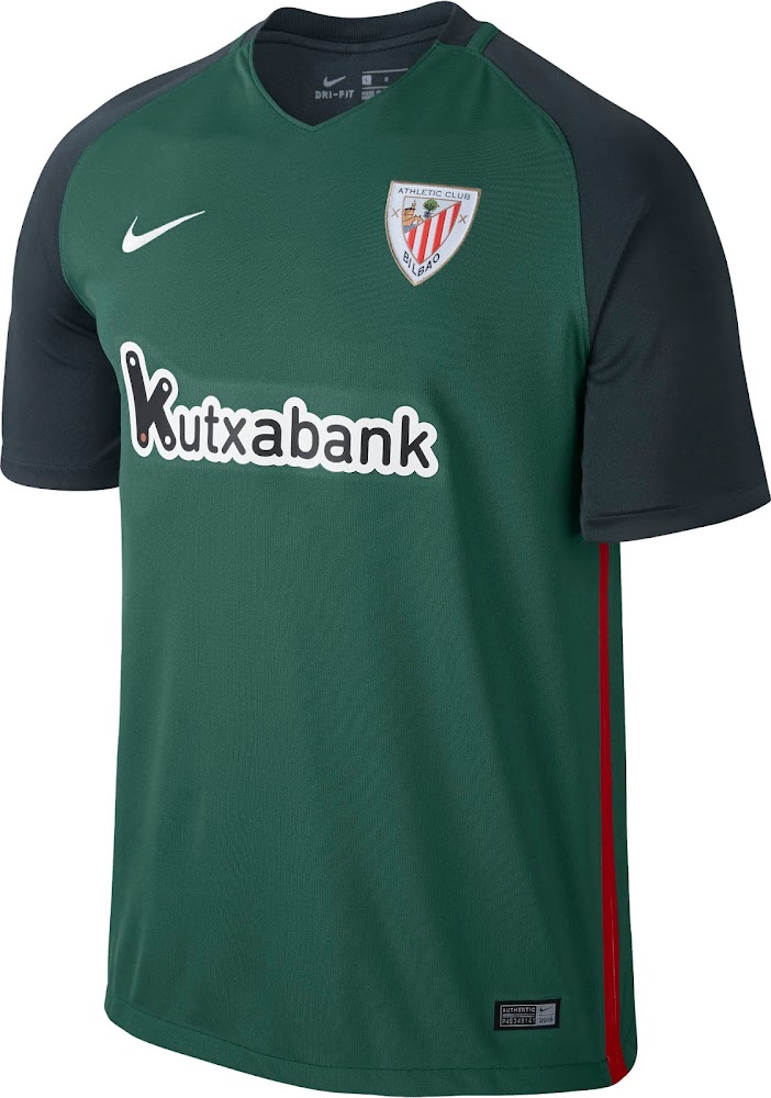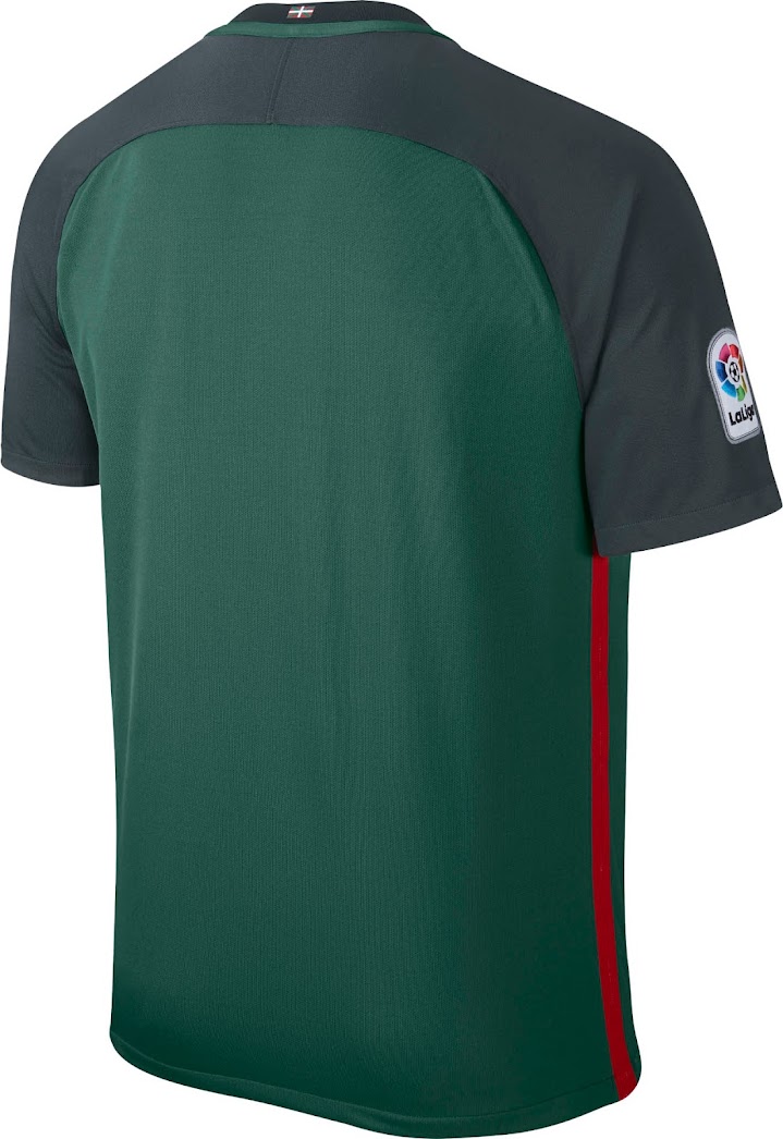 Das Athletic Bilbao 16-17 Trikot, das auf Nikes allgegenwärtigem "Template" basiert, ist dunkelgrün mit Raglanärmeln, die in einem noch dunkleren Ton der Farbe abgesetzt sind. Details in der Hauptfarbe sind in Form einer Linie um die Rückseite des Kragens des Athletic Bilbao 2016-2017 Trikots vorhanden. Zudem verläuft auf jeder Seite des neuen Athletic-Bilbao-Trikots ein roter Streifen.