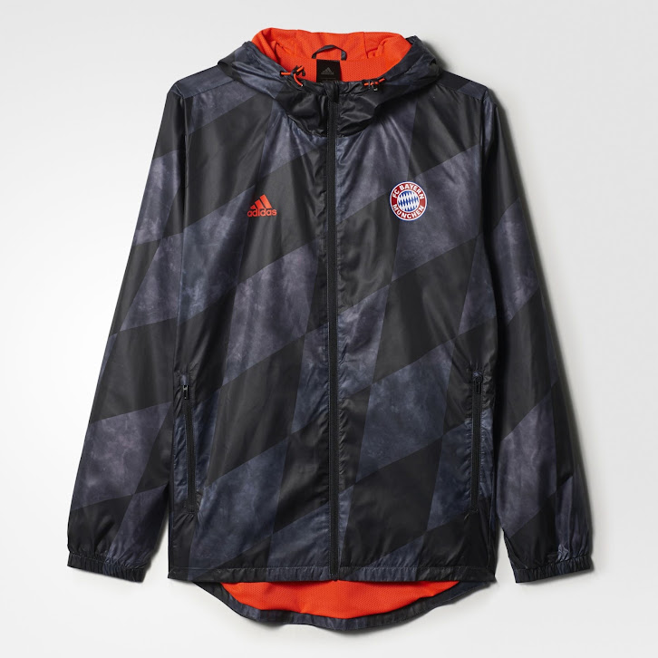 Adidas Bayern München 2016-2017 Windjacke hat das Bayern-München-Wappen auf der linken Brust. Die Jacke, die mit leichtgewichtigem Polyester hergestellt wird, um perfekten Schutz vor dem Wetter zu bieten, ist für 75 Euro in Adidas Onlinestore erhältlich.