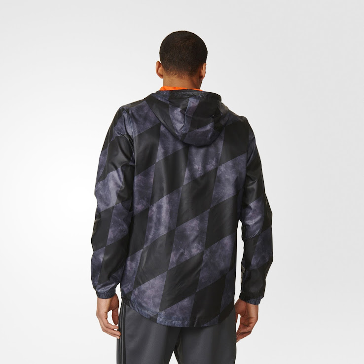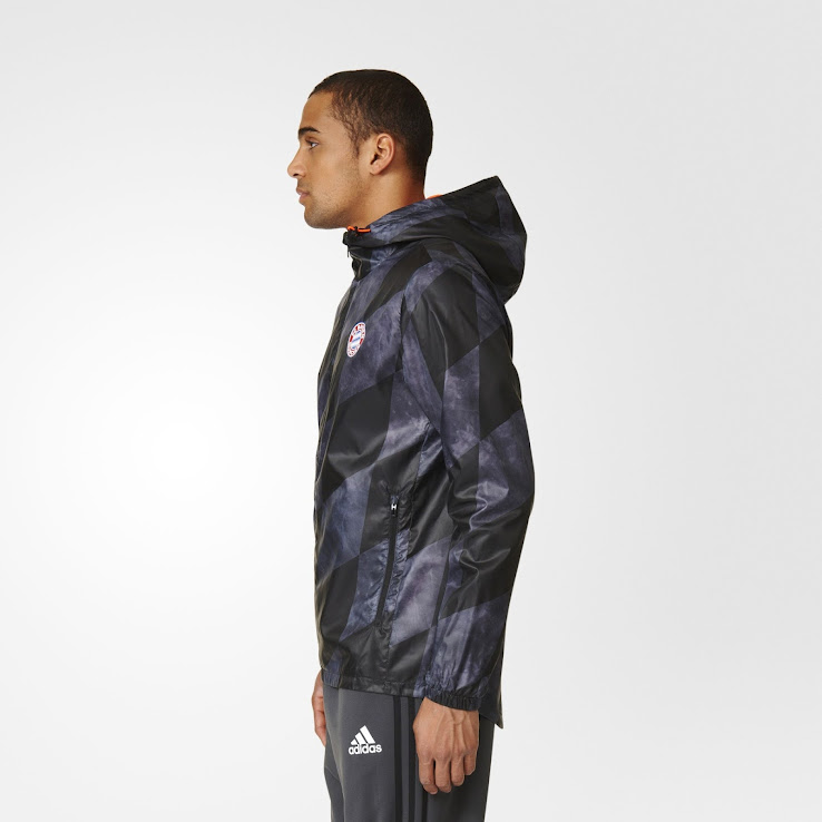 Die neue Bayern München 2016-17 Windjacke weist das selbe geometrische Muster wie das geleakte Bayerische München 2016-2017 Trikot auf. Aber während das neue Bayern München 2016-2017 Trikot nur auf den Ärmeln auf das von der bayerischen Flagge inspirierte Design setzt, integriert die schwarze Bayern-München-Windjacke das Design in Form eines Drucks, der sich über das gesamte Material zieht.