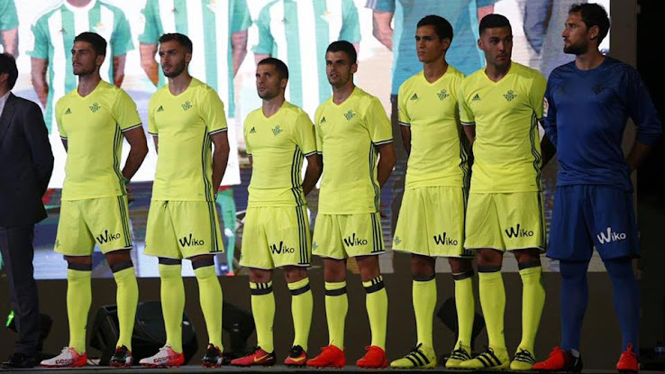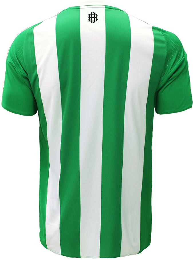 Das Betis 2016-17 Trikot, das den gleichen Kragen wie das neue Real-Sociedad-Heimtrikot aufweist, ist hauptsächlich grün und weist auf Vorder- und Rückseite drei weiße Streifen auf. Der oben erwähnte Kragen, ein runder, ist weiß mit feinen grünen Details um die Seiten und den hinteren Teil. Weiße oder schwarze Stutzen werden zusammen mit dem neuen Betis-Trikot getragen - abhängig vom Gegenüber.