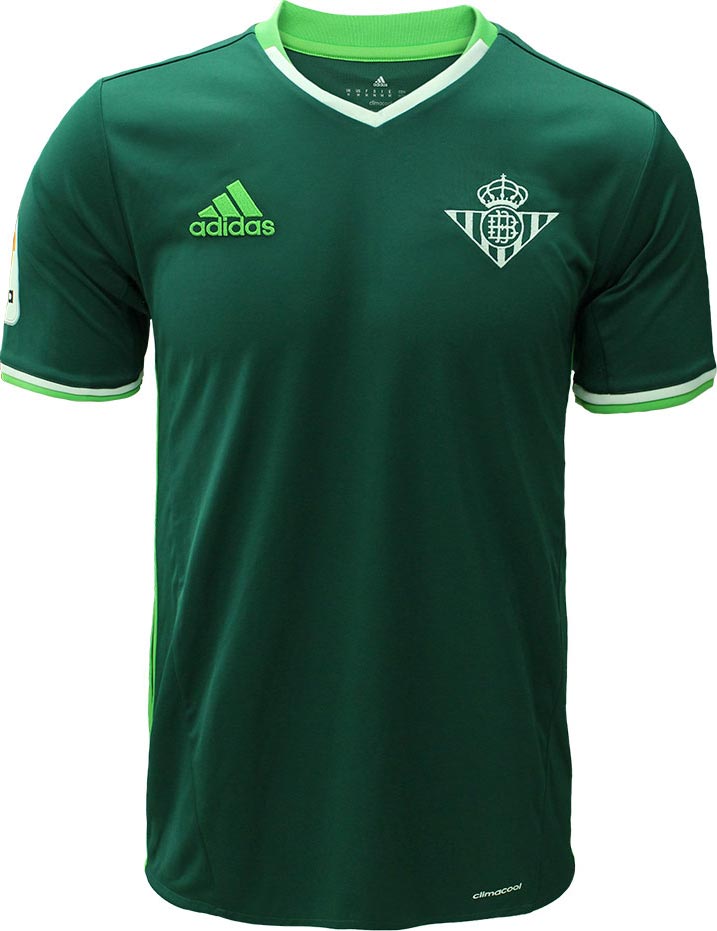 Das Betis 2016-17 Trikot, das den gleichen Kragen wie das neue Real-Sociedad-Heimtrikot aufweist, ist hauptsächlich grün und weist auf Vorder- und Rückseite drei weiße Streifen auf. Der oben erwähnte Kragen, ein runder, ist weiß mit feinen grünen Details um die Seiten und den hinteren Teil. Weiße oder schwarze Stutzen werden zusammen mit dem neuen Betis-Trikot getragen - abhängig vom Gegenüber.