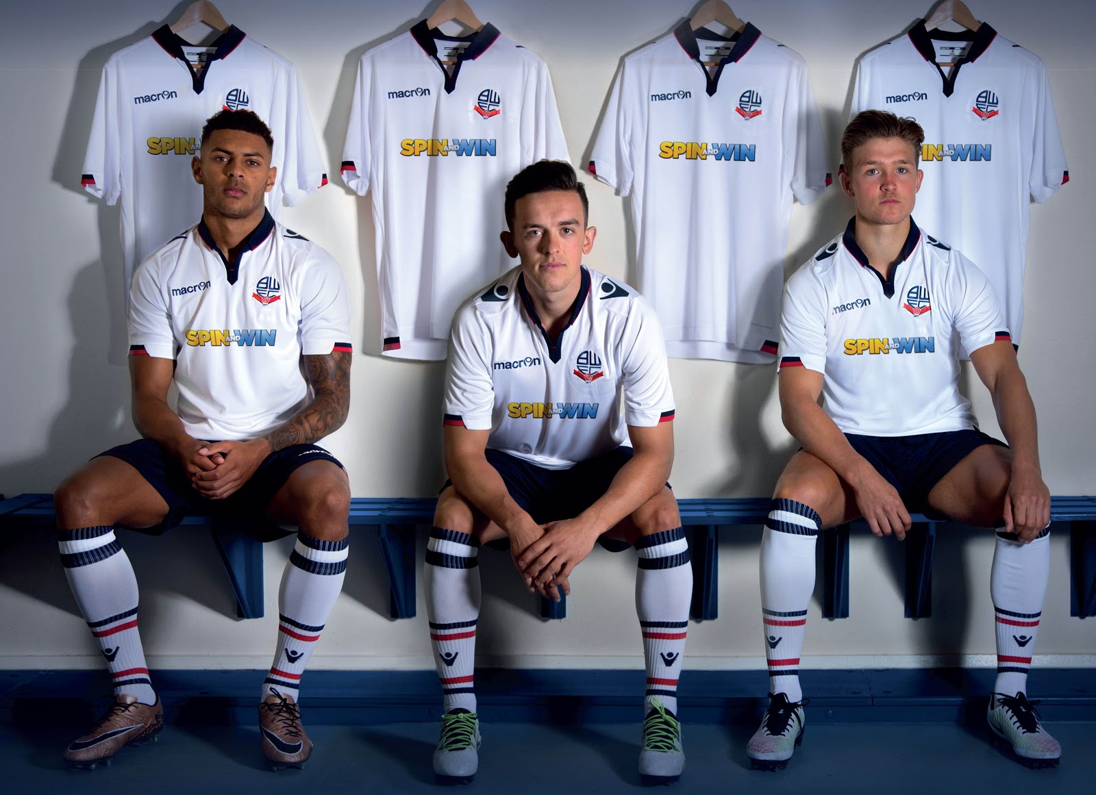 Das Bolton 2016-17 Trikot, das eine weiße Grundlage mit dunkelblauen Applikationen und roten Details kombiniert, führt einen klassischen Look für den League-One-Klub ein. Das Bolton Wanderers 16-17 Trikot, das von Macron hergestellt wird, wurde am 21. Juli 2016 vorgestellt und weist den neuen wichtigsten Trikot-Sponsor spinandwin.com zum ersten Mal auf der Vorderseite auf.
