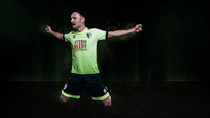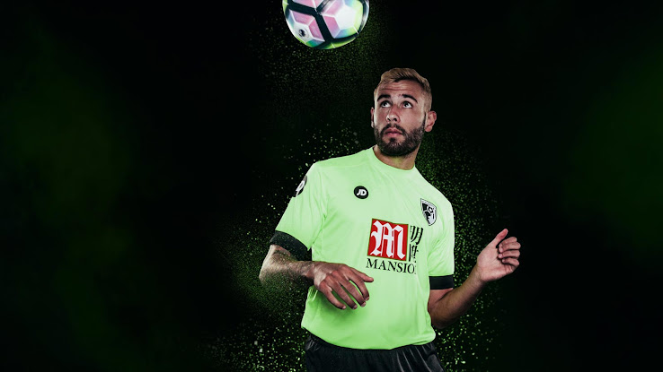 Das Bournemouth 2016-17 Trikot hat ein auffälliges Design, das eine grelle grüne Farbe mit schwarzen Details in Form der Ärmelenden, des Saums und eines Streifens auf jeder Schulter kombiniert. JD-Logos sind auf den Ärmeln und der Brust des neuen Bournemouth-Trikots vorhanden, das eine einfarbige Version des Vereinswappens verwendet.
