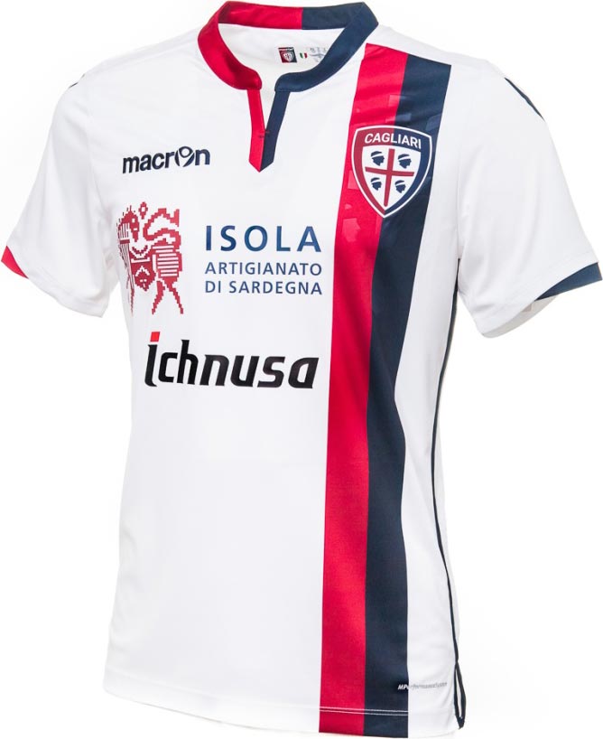 Das neue Cagliari 2016-17 Trikot, das von Macron hergestellt wird, führt ein sauberes geteiltes Design mit einem traditionellen Kragen ein. Alle Sponsorenlogos sind weiß, während raffinierte weiße Details auf den Seiten, dem Kragen und den Ärmeln des Cagliari 16-17 Trikots verwendet werden.