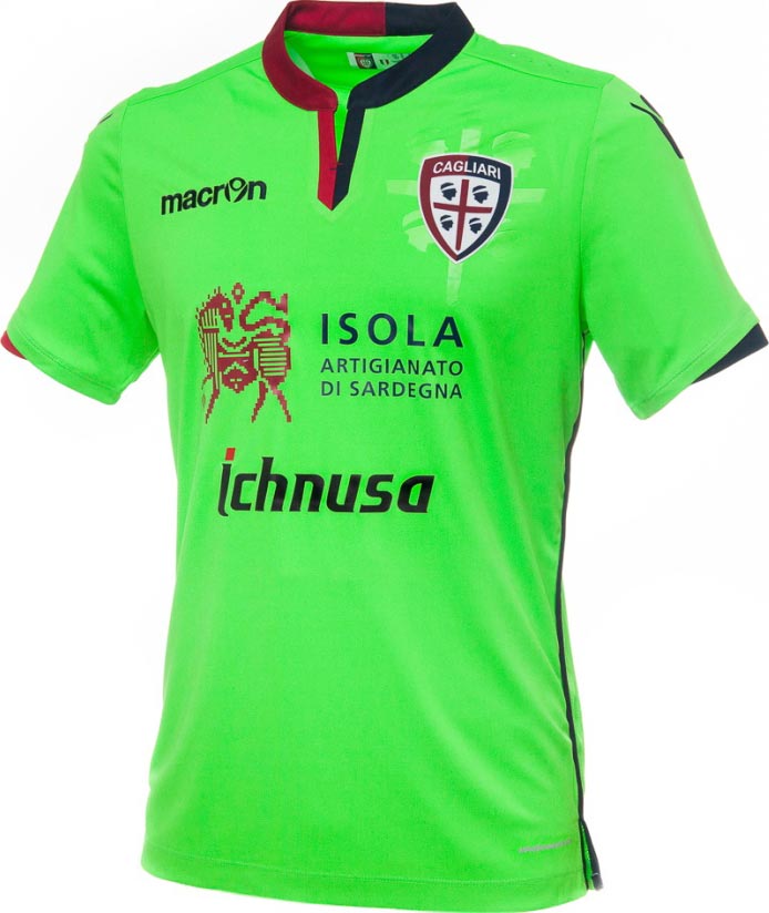 Die Kollektion komplettiert das dritte Cagliari 2016-17 Trikot. Es ist knallgrün mit dunkelroten und dunkelblauen Details auf dem Kragen, den Seiten des Trikots und den Ärmelenden.