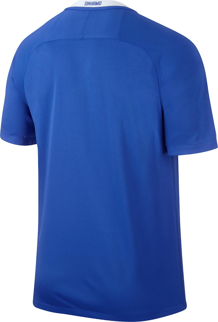 Das Dynamo Moskau 2016-17 Trikot, das auf dem Nike-Template basiert, ist blau mit einem weißen Kragen und weißen Sponsorenlogos. Es weist einen kyrillischen "Dynamo"-Schriftzug auf der Rückseite des Kragens auf und wird mit weißen Hosen und blauen Stutzen kombiniert.