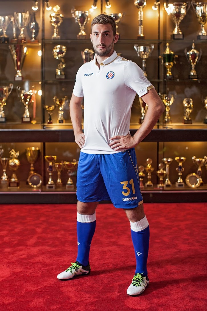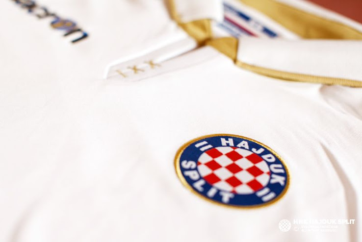 Das neue Hajduk Split 2016-2017 Trikot ist weiß mit goldenen Applikationen, um das 105-jährige Jubiläum des Klubs zu ehren. Es hat ein Wappen des Klubs auf die Vorderseite des Trikots gestickt und auf der Rückseite des Kragens steht der Schriftzug Hajduk in Gold.