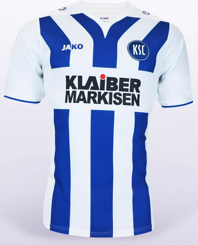 Das neue Karlsruhe 2016-17 Trikot ist wieder in den Farben der Flagge Badens, Karlsruhes Heimatregion, gehalten. Es basiert auf dem gleichen Design wie das Heimtrikot.