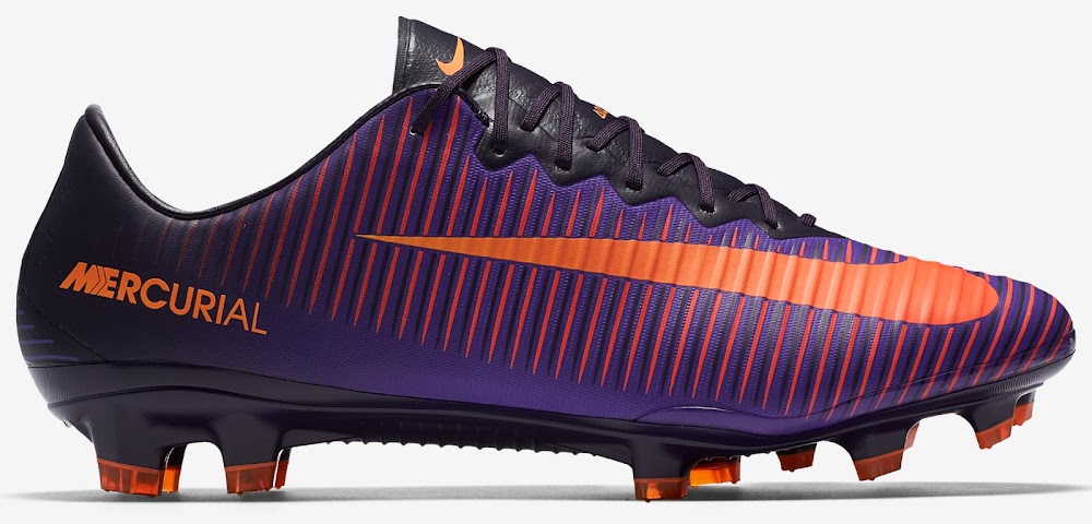 Die neuen Nike Mercurial Vapor 11 Schuhe, die hauptsächlich lila sind, kombinieren diese relativ unauffällige Grundlage mit orangen Details. Orange Details sind auf den lila Nike Mercurial 2016-2017 in Form von allen Markenzeichen, den Stollen und der neuen, kultigen "Speed Rib"-Textur des Mercurial vorhanden. Zudem weisen die Floodlights Pack Nike Mercurial Vapor XI 2016 Fußballschuhe einen subtilen Farbübergang vom relativ dunklen Lila hinten zu dem dynamischeren, hellen Lila vorne auf.