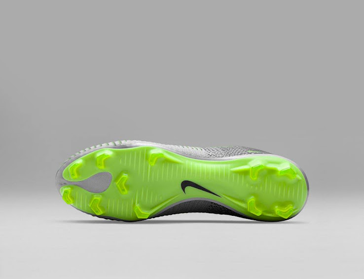Der Nike Mercurial 2016-2017 Elite Pack Schuh geht von Hellgrau im Vorderfußbereich zu Dunkelgrau im Fersenbereich über. Nike kombiniert das silberne Obermaterial mit einem kontrastierenden schwarzen Swoosh und einer grünen Außensohle.
