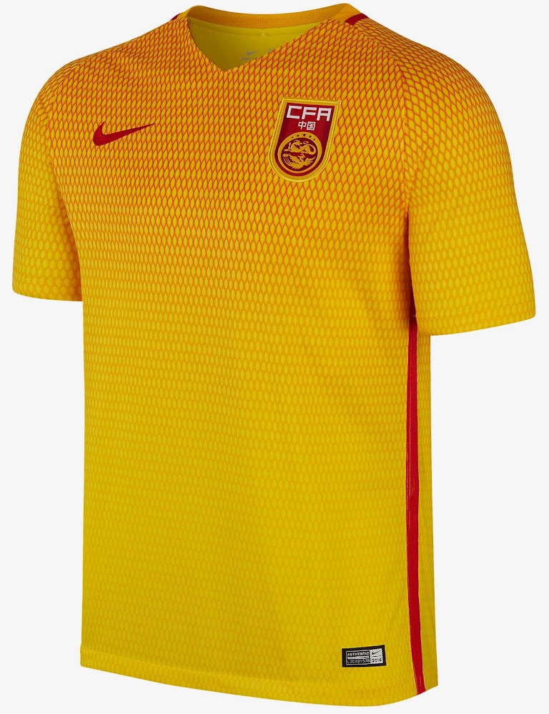 Das neue China 2016 Trikot, das Nikes berühmten Swoosh auf der rechten Brust und das CFA-Logo auf der linken Brust aufweist, setzt auf gelbe Details auf dem Kragen.