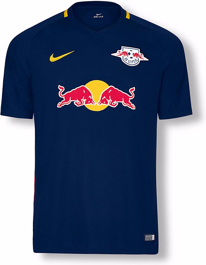 Das neue Leipzig-Trikot, das auf dem selben Grundtemplate basiert, ist dunkelblau mit gelben Details um die Rückseite des Kragens und einem roten Streifen auf jeder Seite. Das Trikot weist einen runden Kragen auf, während der Nike-Swoosh auf der Vorderseite des RB Leipzig 2016-2017 Trikots auch gelb ist.