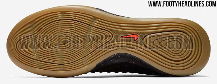 Die Lunarlon-Zwischensohle des neuen Nike MagistaX Finale II ist schwarz mit orangen Farbspritzern, während die Außensohle auf der Hallenversion hellbraun und auf der Outdoor-Version (Hartplatz) schwarz ist.