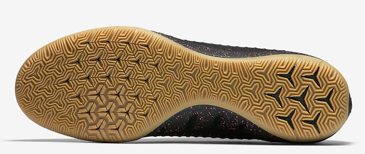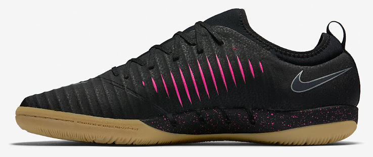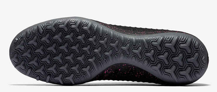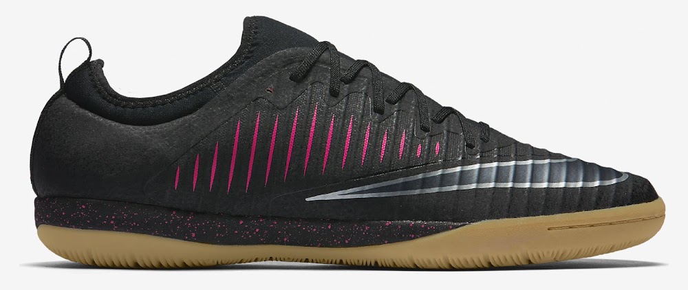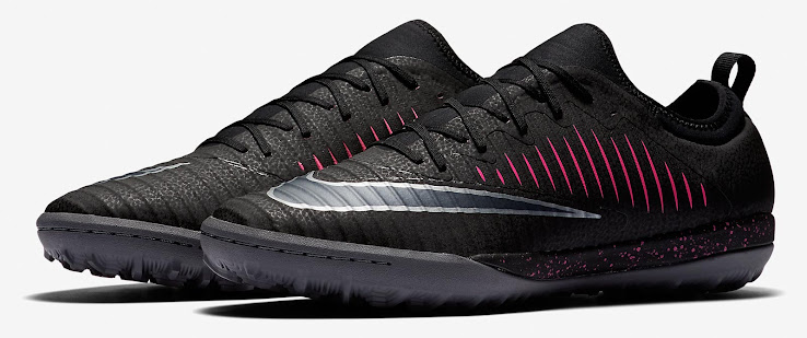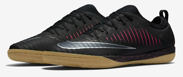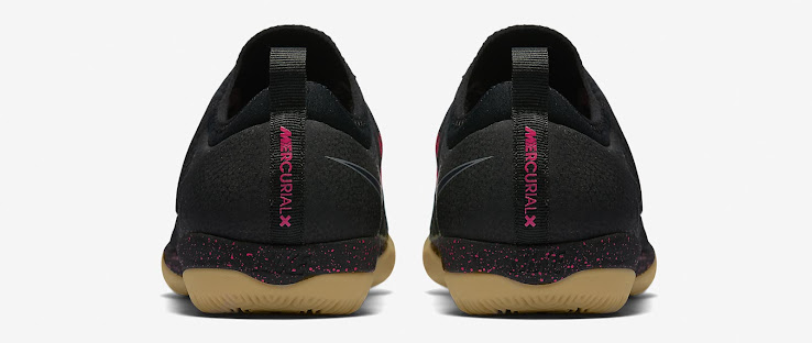Die neuen Nike MercurialX Finale Schuhe, die von den Mercurial Superfly V und Vapor XI Fußballschuhen aus der Nike Pitch Dark Kollektion inspiriert wurden, sind schwarz mit silbernen, reflektierenden Swooshs und subtilen pinken Applikationen. Zu guter Letzt ist die Zwischensohle schwarz mit pinken Farbspritzern, während die Außensohle hellbraun bei der Hallenversion beziehungsweise schwarz bei der Hartplatzversion ist.