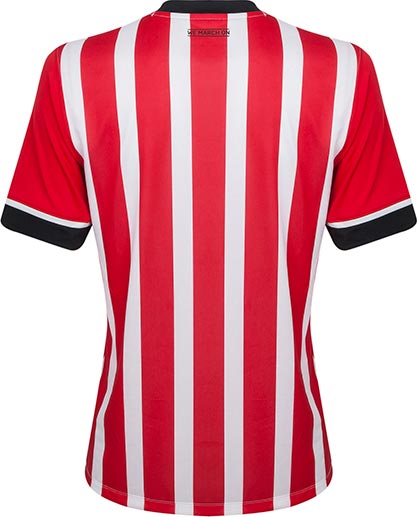 Das neue Southampton 2016-2017 Trikot weist die traditionellen roten und weißen Streifen des Klubs auf der Vorderseite auf, während ein weißes Panel am oberen Ende vorhanden ist, das die Under Armour und Southampton FC Logos umgibt. Southamptons Vereinsmotto "We march on" ist in das Innere des Kragens des Southampton 16-17 Trikots gedruckt. Die Ärmel sind einfarbig rot mit schwarzen und weißen Enden.