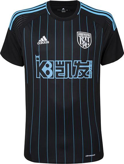 Das neue West-Bromwich-Albion-Trikot, das hauptsächlich schwarz ist, weist hellblaue Nadelstreifen auf der Vorderseite auf, die gut zum Logo des Hauptsponsors UK-K8.com passen. Die selbe Farbe wird ebenfalls für die Adidas-Streifen verwendet, die auf den Schultern des West Bromwich 16-17 Trikots platziert sind, während die Adidas- und West-Bromwich-Logos, wobei das Letztere in einer einfarbigen Version verwendet wird, beide weiß sind.