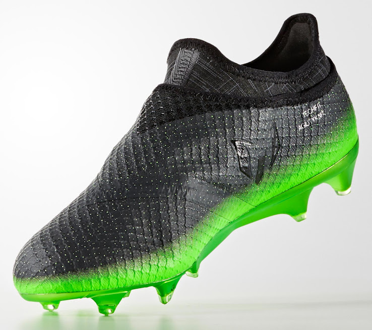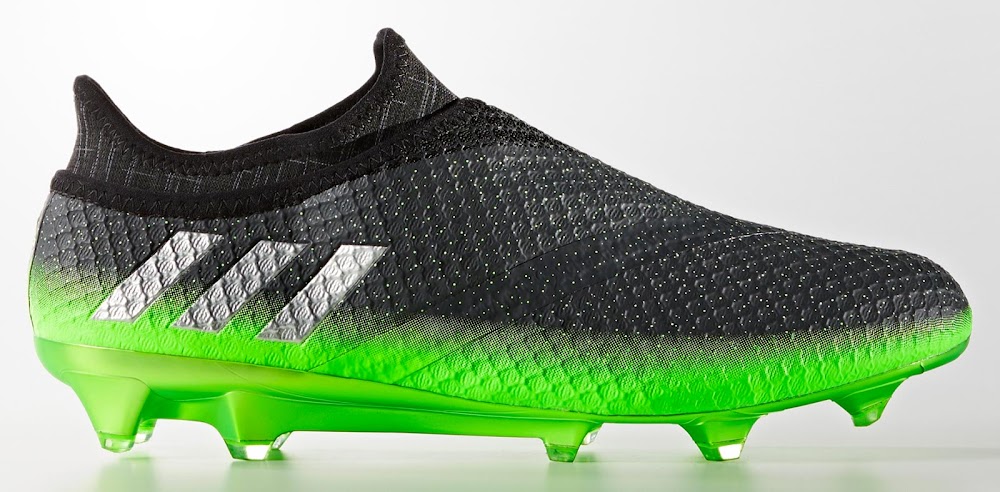 Während die ersten Farbvarianten der neuen Adidas Messi 16+ PureAgility Fußballschuhe allzu einfache, einfarbige Angelegenheiten waren, kombiniert diese neue Farbvariante in Form eines Farbübergangs ein dunkles Grau mit auffälligem Grün, womit der untere Teil grün und der obere grau ist.