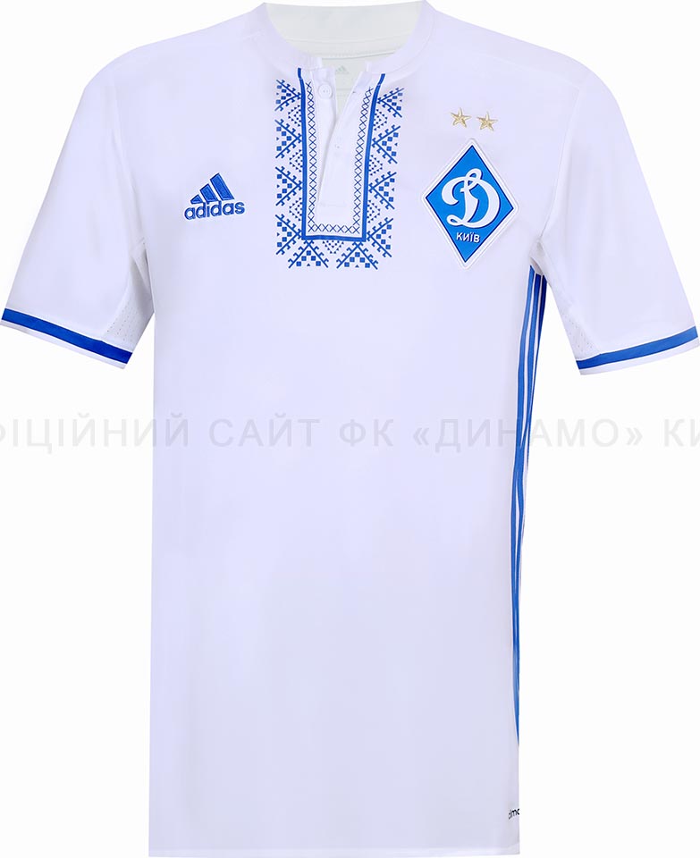 Das Dynamo Kiew 2016-17 Trikot, das hauptsächlich weiß ist, hat einen Henleykragen mit Knöpfen, der mit einem typischen ukrainischen Muster verziert wurde, das dem ähnelt, was Adidas auf den 2012-Trikots der ukrainischen Nationalmannschaft verwendet hat. Des Weiteren weist das Dynamo Kiew 16-17 Trikot ein großes Vereinswappen und blaue Akzente in Form der Adidas-Streifen, die seitlich angebracht sind, und der Ärmelenden auf.