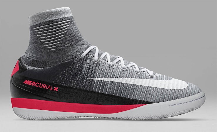 Die Nike MercurialX Proximo Air Max Heritage Fußballschuhe, die möglicherweise die schärfsten der Kollektion sind, kombinieren die unauffälligen Farben Grau und Schwarz mit gewagten pinken Applikationen.