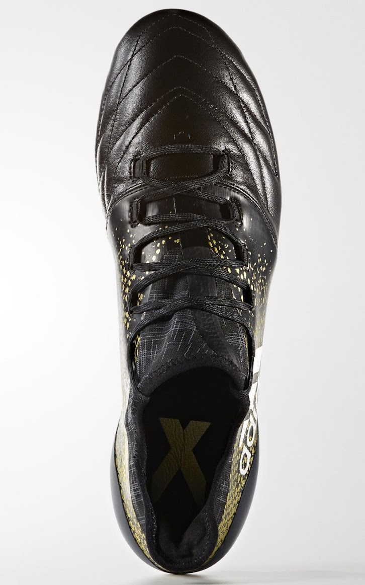 Die neuen Adidas X 16.1 Lederschuhe, die hauptsächlich schwarz sind, gehen mittels eines von Tieren inspirierten Grafikdrucks im hinteren Teil zu Gold über. Das vergrößerte Adidas-Performance-Logo auf der Außenseite der schwarz / goldenen Adidas X 16.1 Leder-Fußballschuhe ist weiß, wie auch die "X"- und "techfit"-Markenzeichen auf der Innenseite.