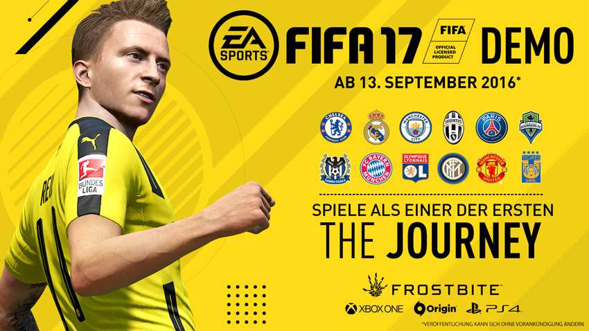 Nicht weniger als 12 Teams sind in der FIFA 17 Demo enthalten: Manchester United, Real Madrid, Bayern Munich, Juventus, Paris Saint-Germain, Chelsea, Gamba Osaka, Manchester City, Olympique Lyon, Inter, Seattle Sounders und Tigres UANL. Zudem wird es möglich sein, "The Journey", FIFA 17s völlig neuen Spielmodus, auszuprobieren.