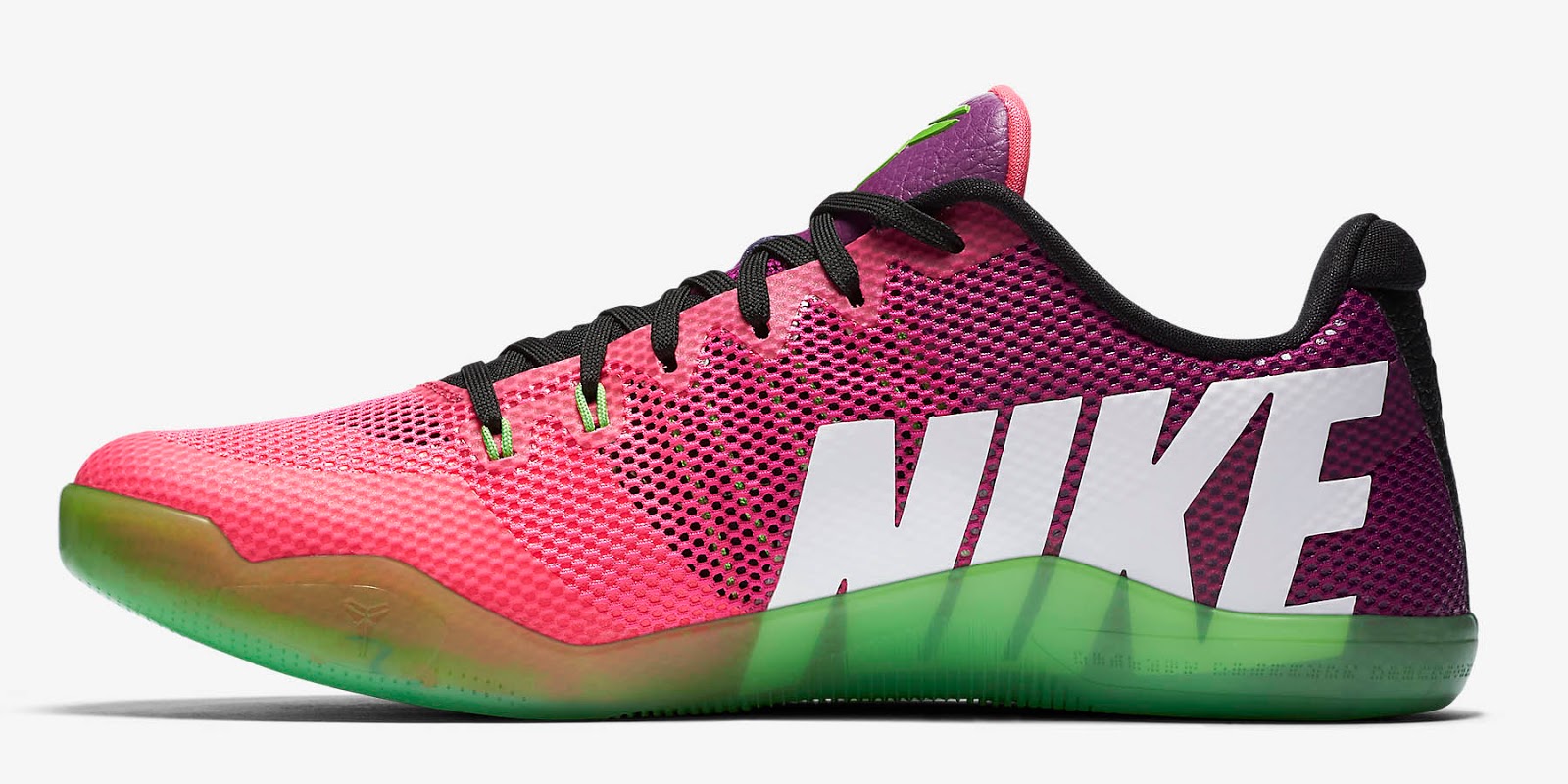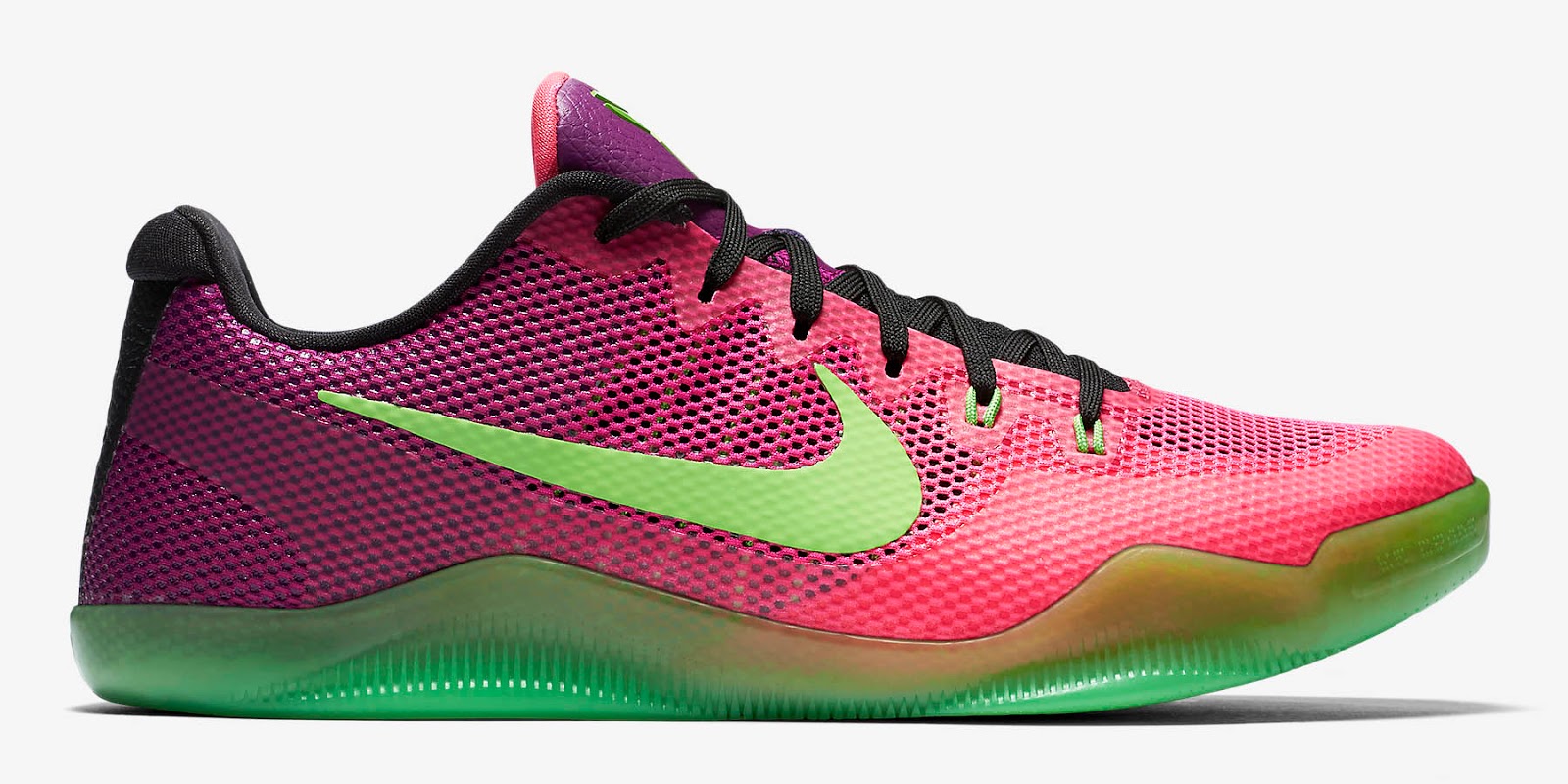 Die Nike Kobe 11 Mambacurial "Original" Basketballschuhe, die den Look der allerersten Nike Mambacurial Schuhe widerspiegeln, wurden entworfen, um herauszuragen. Der Original Mambacurial 11 Schuh, der aus den Farben Rot, Grün und Pink zusammengesetzt ist, weist einen einfarbigen, grünen Swoosh, eine grüne Außensohle und einen pink / lila Farbübergang auf.