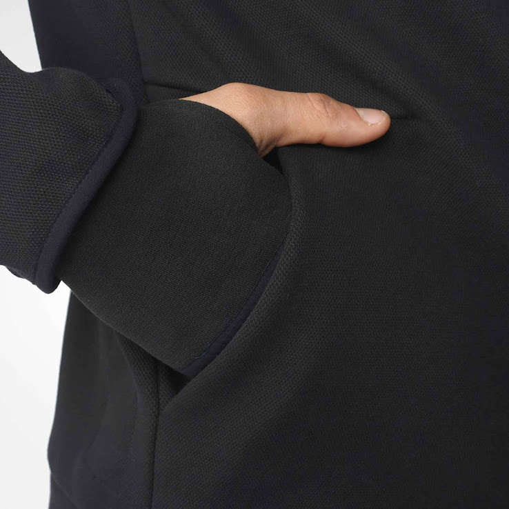 Der Hoodie, der hauptsächlich schwarz ist, weist ein einfarbiges Vereinswappen auf der linken Brust auf, wobei das berühmte Champions-League-Logo auf der gegenüberliegenden Seite platziert ist. Eine subtile Linie verläuft vom Kragen zu den oberen Ärmeln des Hoodies, während ein ähnlich unscheinbares Adidas-Performance-Logo auf dem linken Ärmel zu sehen ist.