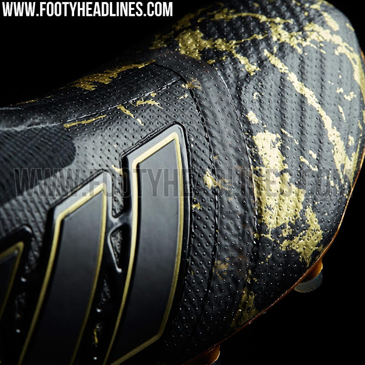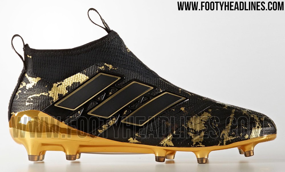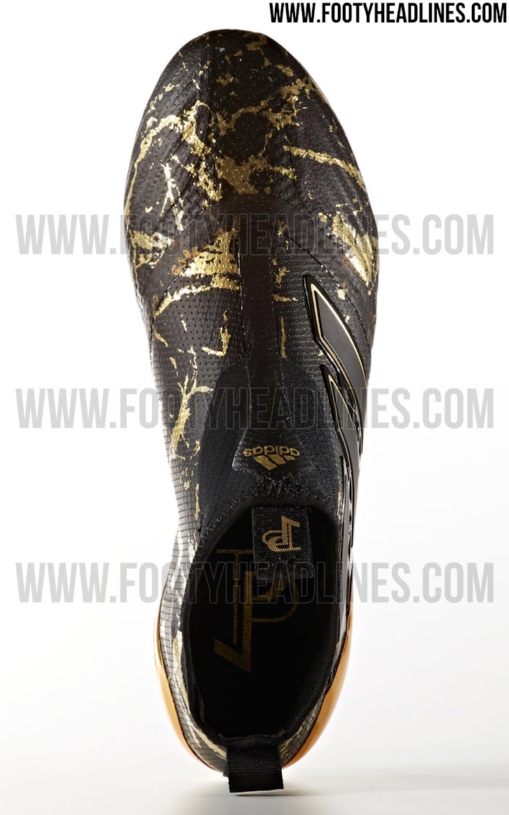 Wie die allerersten Adidas "Pogboom" Schuhe aus dem März 2016 kombinieren die neuen Adidas Ace 17+ PureControl Pogba Fußballschuhe eine schwarze Grundlage mit goldenen Details. Die letztere Farbe wird für die Außensohle der eigenen Adidas Ace 17+ PureControl Pogba Schuhe als auch für die Umrandung der 3-Streifen auf der Außenseite verwendet. Ein subtiles, marmorartiges, goldenes Muster ist auch im hinteren Teil vorhanden.