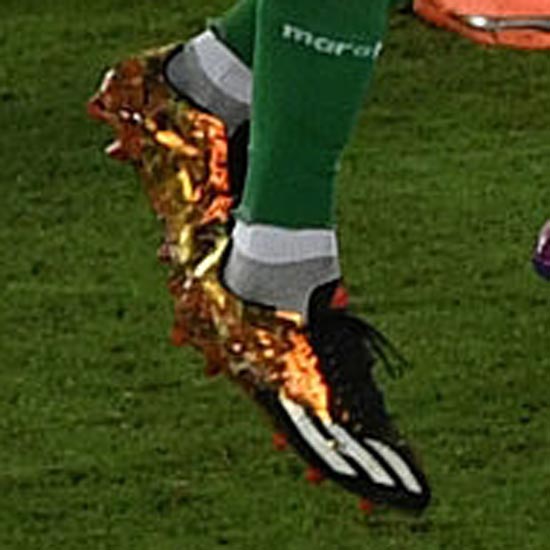 Das ist eine Nahaufnahme der einzigartigen Fußballschuhe, die von Duk getragen wurden.