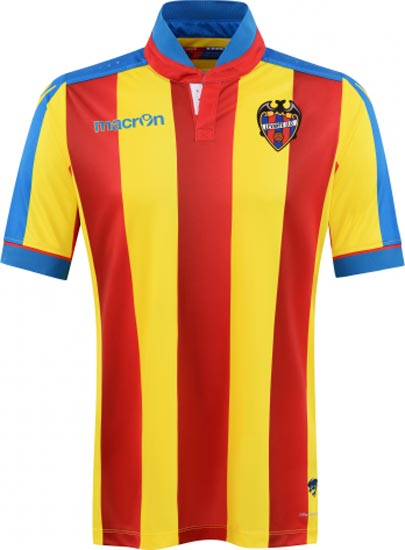 Das Levante 2016-2017 Senyera-Trikot, das auf einem klassischen Template basiert, kombiniert eine rot-gelb gestreifte Grundlage mit blauen Details, wie manche Valencia-Trikots der vergangenen Jahre. Letztendlich ist es der Senyera, der Flagge der Region von Valencia, aus der der Klub stammt, nachempfunden.