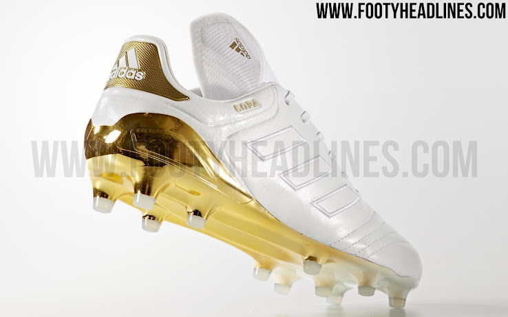Die Limited-Edition Crowning Glory Adidas Copa 17 Schuhe, die sich durch ein Design auszeichnen, das dem jüngst vorgestellten Stellar Pack recht ähnlich ist, sind weiß mit goldenen Akzenten. Die goldene Farbe wird vor allem für den hinteren Teil der Außensohle der Adidas Copa 17.1 Crowning Glory Fußballschuhe verwendet, während die Details an der Ferse und viele Markenzeichen ebenfalls in "Gold-Metallic" gehalten sind.