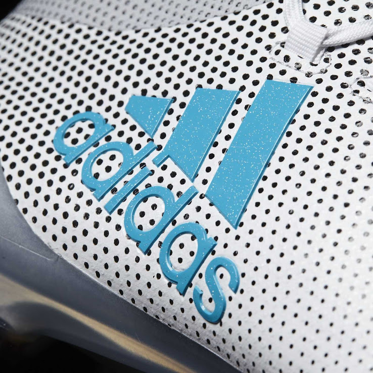 Polkapunkte strecken sich über den hinteren Teil und die Gesamtheit der Socke der weiß-grauen Adidas X 17 Fußballschuhe. Zu guter Letzt sitzen große Adidas-Performance- und X-Logos jeweils in hellem Blau auf Außen- und Innenseite der Adidas X 17.1 Dust Storm Schuhe.
