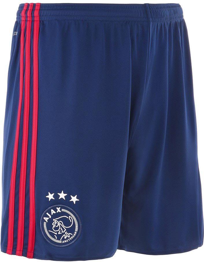 Die Hosen und Stutzen des Ajax 17-18 Trikots sind auch dunkelblau mit roten und weißen Details sein.