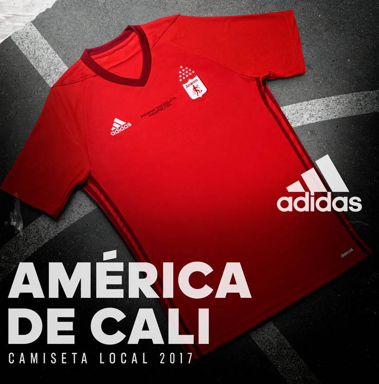 Das neue América de Cali 2017 Trikot, das auf Adidas Template basiert, das für viele 2016-2017 Trikots verwendet wird, setzt auf die traditionelle Hauptfarbe der Red Devils. Adidas kombiniert die rote Farbe mit Weinrot für den Kragen und die drei Streifen.