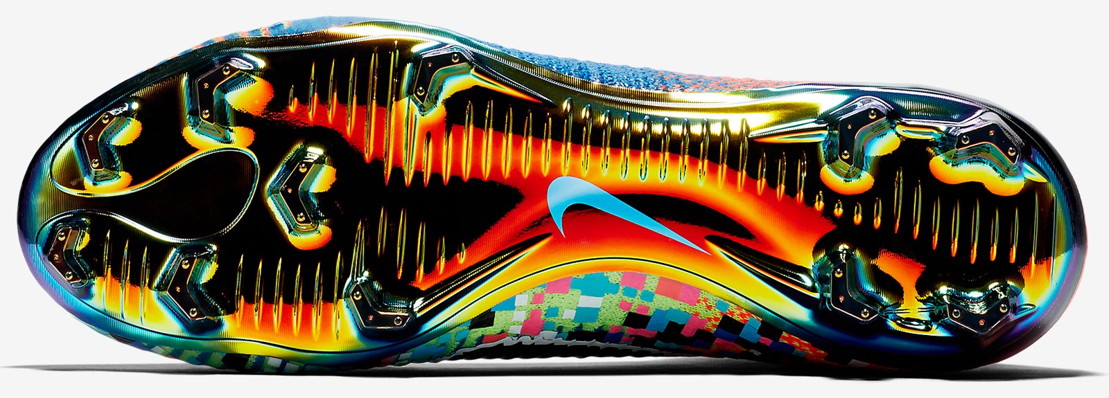 Die Nike Mercurial Superfly x EA Sports Schuhe zeichnen sich durch ein herausragendes, mehrfarbiges Design aus, das als Anspielung auf die Fortschritte in der Videospieltechnologie von einer pixeligen 16-Bit-Grafik auf der Innenseite zu Hochauflösung auf der Außenseite übergeht.