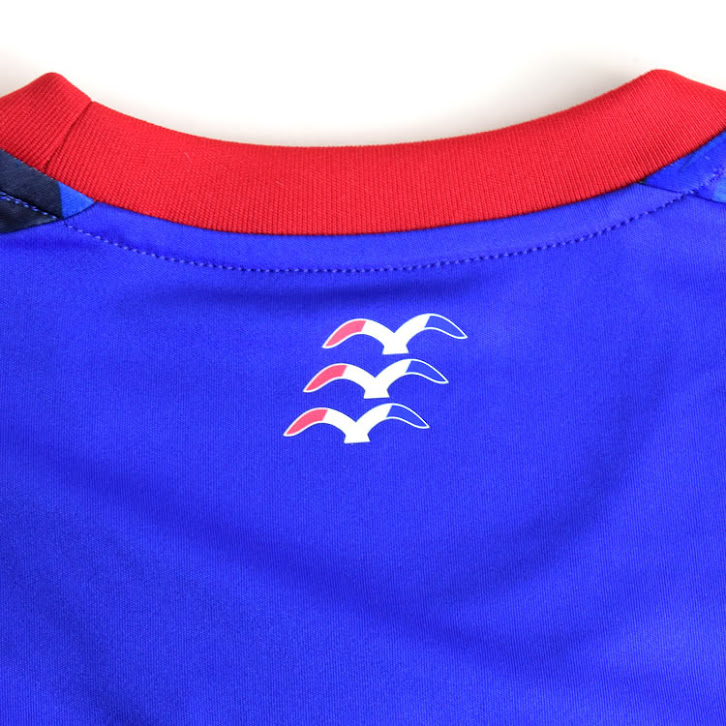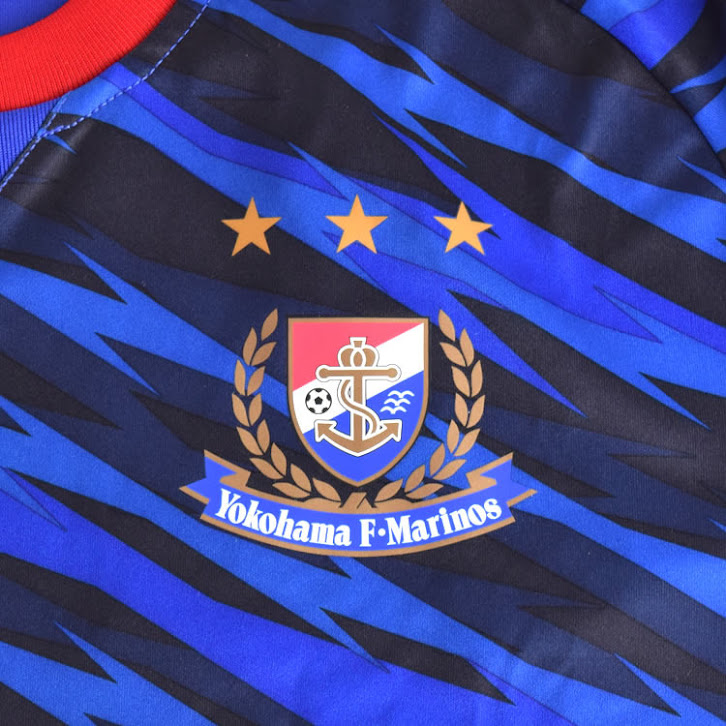 Das neue Yokohama F·Marinos 2017 Trikot zeichnet sich durch einen atemberaubenden Grafikdruck auf der gesamten Vorderseite und den Ärmeln aus, um Geschwindigkeit zu symbolisieren. Das blaue Trikot wird mit weißen Logos und roten Applikationen kombiniert, die für den Kragen und die Ärmelenden verwendet werden.
