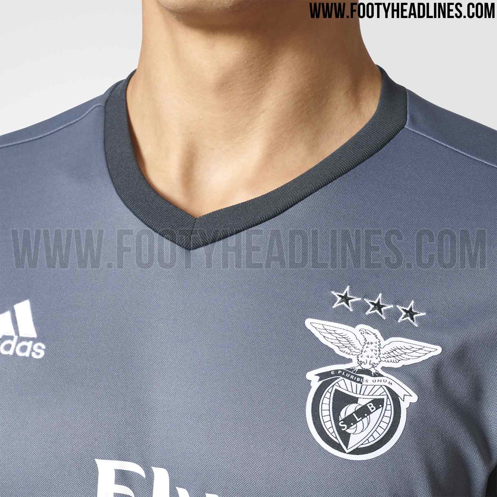Das neue Benfica-Auswärtstrikot für die Saison 2017-18, das von Benficas berühmten Adlermaskottchen inspiriert wurde, kombiniert die Hauptfarbe "Onix" (Hellgrau) mit dunkelgrauen Ärmeln und Kragen - die Logos auf der Vorderseite und die seitlichen Adidas-Streifen sind auf dem Benfica 17-18 Trikot weiß.