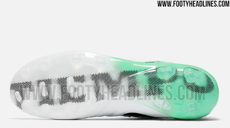 Die hauptsächlich weißen Nike Tiempo Legend VI Schuhe, die entworfen wurden, um auf dem Platz herauszuragen, weisen, genauso wie alle Schuhe aus Nikes weißem 2017 Fußballschuh-Pack, einen auffälligen grünen Farbübergang auf der Außensohle als auch zwei Nike-Swooshs, die von Schwarz zu Weiß übergehen, auf.