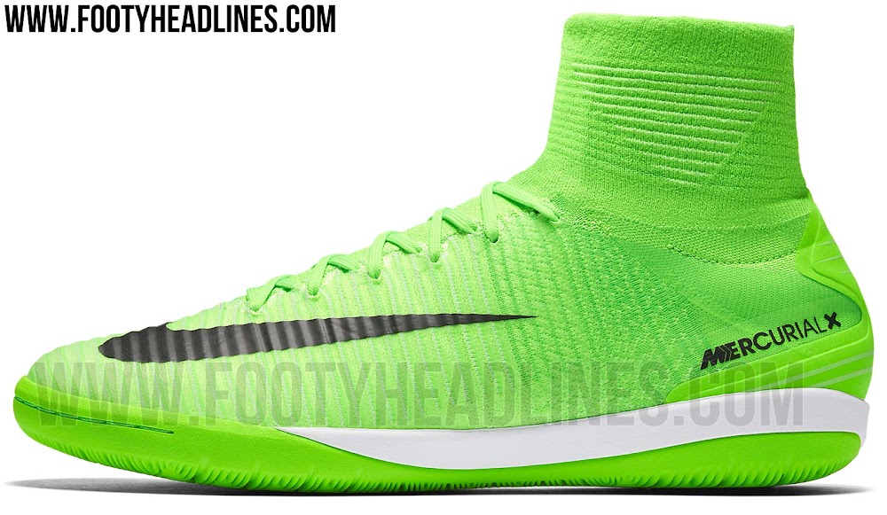 Die ersten 2017 Nike MercurialX Proximo II Fußballschuhe, die fast identisch mit der Rasenversion sind, sind fast völlig grün mit schwarzen Markenzeichen. Eine weiße Zwischensohle und eine grüne beziehungsweise schwarze Außensohle komplettieren die Hallen- und Hartplatzversion.