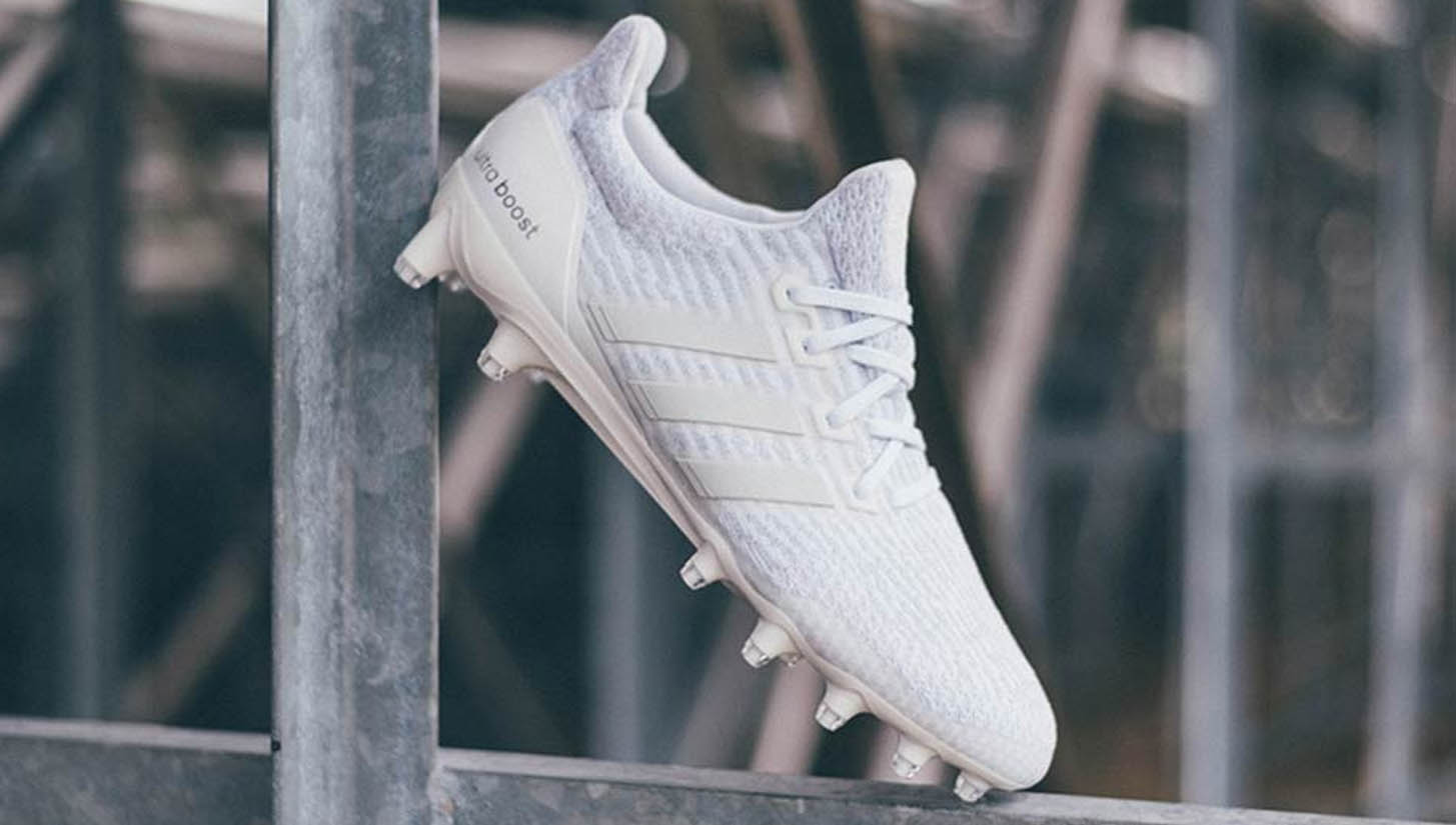 Die neuen weißen Adidas Ultra Boost Footballschuhe haben ein einfarbiges, weißes, aus einem Teil bestehendes Obermaterial, das ein äußerst sauberes Design erschafft.